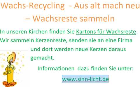 Sammeln Sie Kerzenreste … gerne auch von Freunden & Bekannten? In unseren Gemeinden stehen Sammelbehälter zur Verfügung.