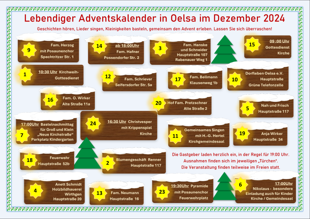 17. Lebendiger Adventskalender in Oelsa Datum/Zeit Sonntag, 01.12.2024 - 24.12.2024, 19:00 Uhr Veranstaltungsort Oelsa und Umgebung