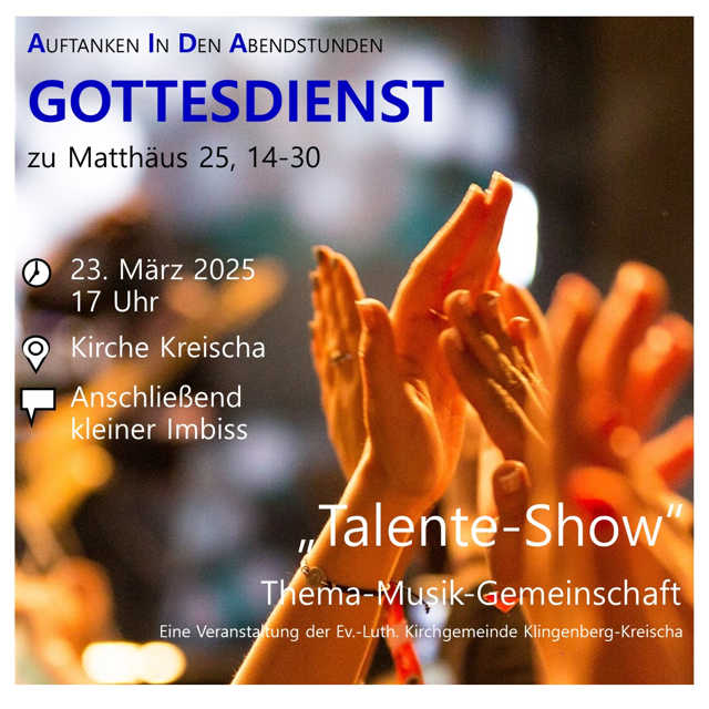 3. Sonntag in der Passionszeit – AIDA-Gottesdienst, Frau Meile Datum/Zeit Sonntag, 23.03.2025, 17:00 Uhr Veranstaltungsort Kreischa, Kirche Kollekte: eigene Gemeinde