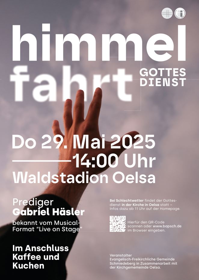 Christi Himmelfahrt – Gottesdienst im Waldstadion Oelsa – Predigt Gabriel Häsler, Moderation Thomas K. Datum/Zeit Donnerstag, 29.05.2025, 14:00 Uhr Veranstaltungsort Oelsa, Waldstadion