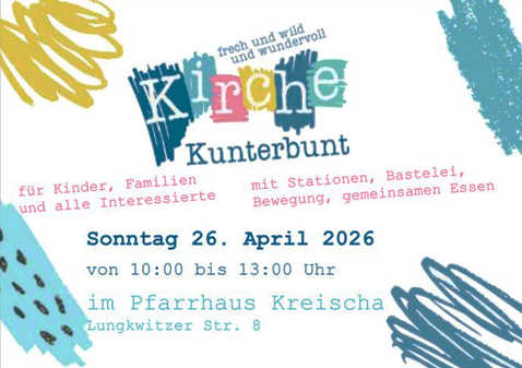 Jubilate – Kirche Kunterbunt, Team Datum/Zeit Sonntag, 26.04.2026, 10:00 Uhr Veranstaltungsort Kreischa, Gemeindehaus Kollekte: eigene Gemeinde