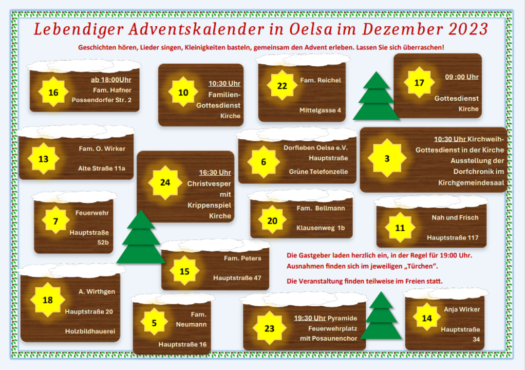 Lebendiger Adventskalender Oelsa Datum/Zeit Freitag, 22.12.2023, 19:00 Uhr Veranstaltungsort Oelsa, Kirche