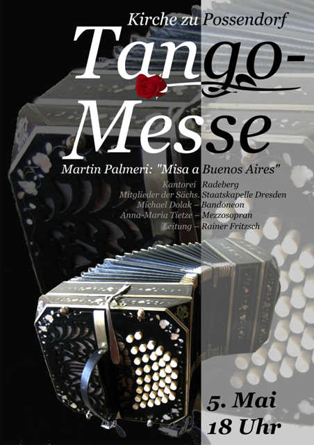 Dazu wird die Kantorei aus Radeberg zu Gast sein, die dieses großartige Werk bereits zweimal aufgeführt hat. Musiker der Sächsischen Staatskapelle aus Dresden werden an den Orchesterpulten in Possendorf spielen. Den Hauptpart auf dem Bandoneon übernimmt der international bekannte Tangospezialist Michael Dolak aus Berlin. Die Gesangssoli singt die junge, aufstrebende Künstlerin Anna‐Maria Tietze aus Dresden.