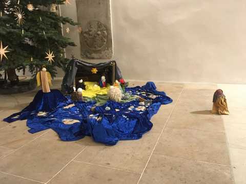Die Figuren (Ein Holzscheit als Körper, Stoffreste verkleiden diesen, der Kopf aus einer Styroporkugel, welche ummantelt wurde mit Gipsbinden) sind zur Weihnachtsgeschichte vor Jahren im ElternKindKreis entstanden. Der Stall wurde mit Hilfe von Jana Köbsch und Kerstin Wrana gebunden und die ganze Landschaft gehörte dieses Jahr zur Ausgestaltung der Kreischaer Kirche für das Weihnachtsfest dazu.