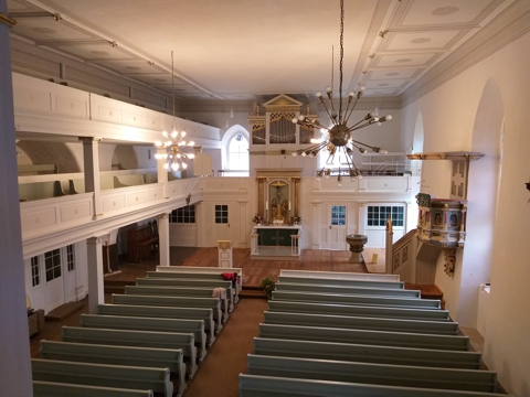 Wir stehen in einem wunderschönen Gotteshaus. Alles ist weiß, die Wände, die Emporen, die schlichten Bänke, die Fenster. Die neuen Dielen sind aus ganz hellem Holz. Die einzigen Ausnahmen sind die silbern strahlenden Orgelpfeifen und die goldenen formschönen Leuchter mit ihren weißen Kerzen.