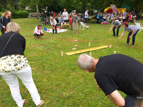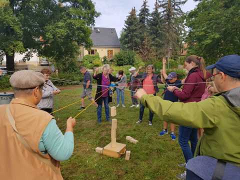 Auch hatten wir noch etwas mitgebracht – das Gemeinschaftsspiel „Teamturm“. Ziel des Spieles ist es, in einer Gruppe Holzklötze mit Hilfe von Schnüren und einem Haken aufzustapeln. Dabei waren viel Konzentration, Ausdauer und Kommunikationsfähigkeit gefragt. Auch wenn man trotz der vielen Mühen über das Umkippen des Turmes für einen kurzen Moment enttäuscht war, sorgte das Spiel für jede Menge Lacher, brachte die Menschen ins Gespräch und verband Generationen. Insgesamt blicken wir auf einen gelungenen Vormittag zurück. Der Bürgerbrunch ist eine tolle Gelegenheit die Bürger und Initiativen in der Gemeinde kennenzulernen und sich auszutauschen. Es verbindet Menschen und fördert den Zusammenhalt. Wir freuen uns auf das nächste Mal! (August 2022)