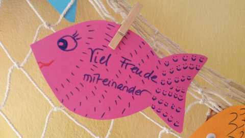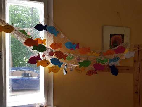 Beim anschließenden Fest im Pfarrhaus mussten/durften die Petrus‐Bilder nochmal gepuzzelt werden, um den Sitz‐Platz zu finden an verschiedenfarbigen Tischen. Für 80 Gäste reichte der Platz gar nicht, aber dank des herrlichen Wetters konnte schnell nach draußen erweitert werden… Nach dem leckeren Kaffeetrinken gab es Beiträge aus mehreren Gemeindegruppen, z.B. Singen, angeregt von der Frauenstunde, Spiele von der JG für die Kinder rund ums Pfarrhaus, Fische gestalten von der Kirchgemeindevertretung, die Buchstaben P E T R U S in verschiedenen Rätseln und Aktionen untergebracht von der Kantorei, besondere Fragen vom Bibelhauskreis ‐ mit Aufstehen, wenn es zutrifft (z.B.: alle, die Haustiere haben; oder: alle, bei denen 4 Generationen unter einem Dach wohnen…), ein Kurzbericht von den Ergebnissen der AG Gemeindeaufbau, wie unsere Kirchgemeinde lebendig und für Fremde einladend wird oder bleibt und wir Menschen „fischen“ können, genau wie Petrus…