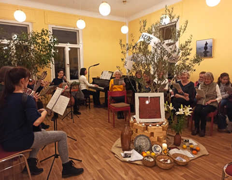 Am 1. März durften wir, ungefähr 50 Frauen, Männer, Jugendliche und zwei Kinder, im Kreischaer Pfarrhaus die Weltgebetstagsordnung der palästinensischen Christinnen zum Thema „…durch das Band des Friedens“ mit beten, mit erleben, mit feiern. Mit viel Engagement wurde der Gottesdienst in Wort und Musik vorbereitet, gestaltet und durchgeführt. Danach aßen wir das palästinensische Gericht Bulgur Mera und führten rege Gespräche. Als zusätzliches Angebot konnte der Spielfilm: „Crescendo“ (2019) angesehen werden, der zum Inhalt ein Konzertprojekt von palästinensischen und israelischen Jugendlichen gegen Hass hat und in sehr eindrucksvoller Weise die Not, die Unversöhnlichkeit, den Unfrieden, die geschichtlichen Verletzungen und Gräben zwischen Palästina und Israel aufnimmt.