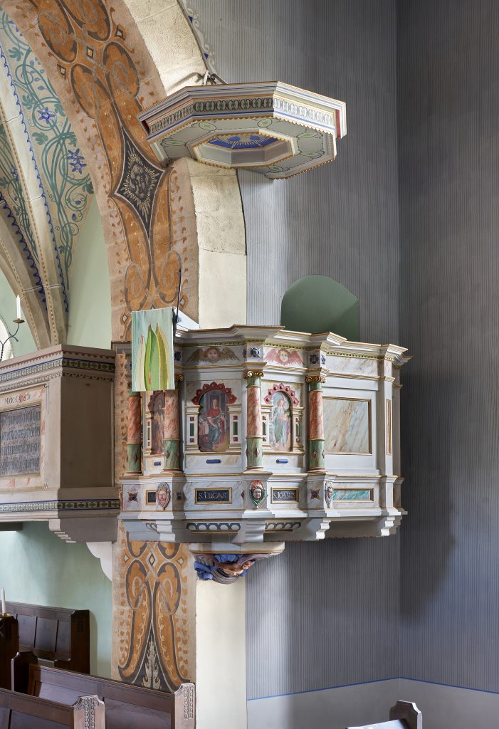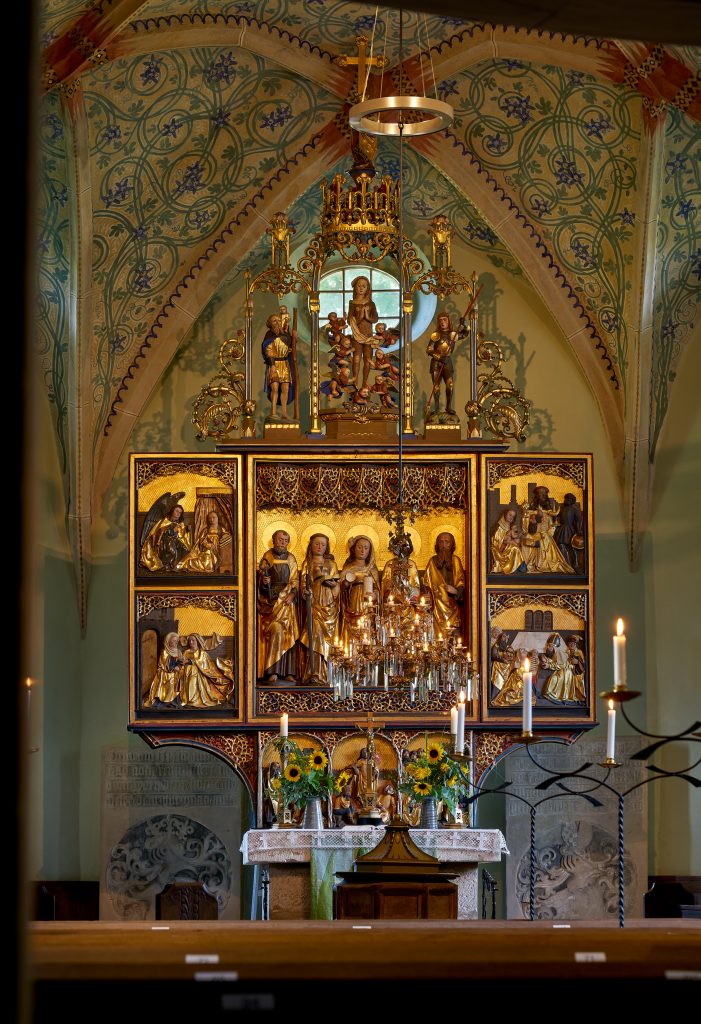 Das Schmuckstück der Kirche ist natürlich der Altar aus dem Jahr 1515, genauer das sog. Altarretabel. Es ist Maria Magdalene gewidmet, ggf. war sie auch die Namenspatronin der Kirche. Sie begegnet uns im Neuen Testament an verschiedenen Stellen, vor allem in den Ostergeschichten. In der Tradition wurde sie mit der Sünderin identifiziert, die Jesus die Füße salbte. Rechts von ihr findet man Katharina von Alexandrien, links Johannes den Täufer; außen Petrus und Paulus. Auf den Flügelinnenseiten finden wir Kindheitsszenen Jesu bzw. die sog. Freuden Mariens. Wird der Altar geschlossen (in der Advents- und Passionszeit) sehen wir Szenen der Passion, flankiert vom Schmerzensmann und der leidenden Muttergottes.